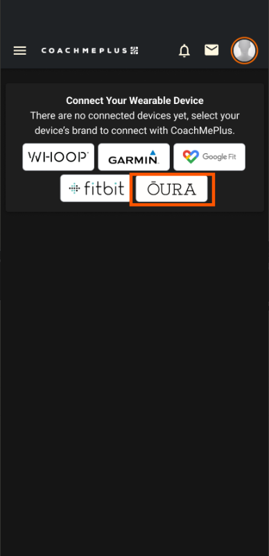 NOTE: Currently you can ONLY connect your Oura Ring account to CoachMePlus while in a Web Browser. This can be on Safari or Google Chrome on your Desktop computer or your mobile phone. You are NOT able to and will not see the Connect Oura Ring link while within the CoachMePlus mobile application on Android or IOS.